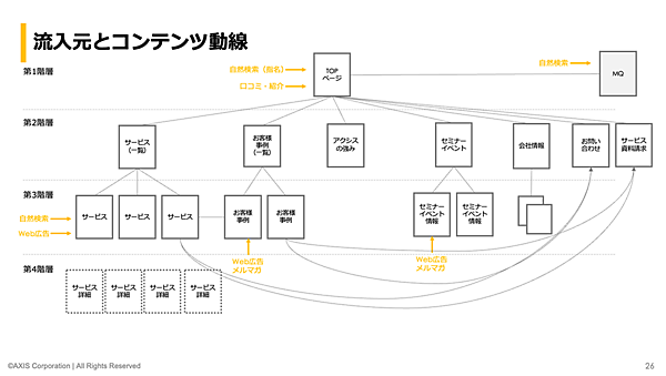 お客様は、トップページから順番に見てくれるとは限りません。検索結果には、サービスページのほうが上位に表示されることもあります。階層ごとに情報を整理し、どんな動線でお客様がページを見るのかを描いてみましょう。お客様になりきって、どういった情報を伝えればお問い合わせや資料請求に行き着くか、ぜひ考えてみてください。