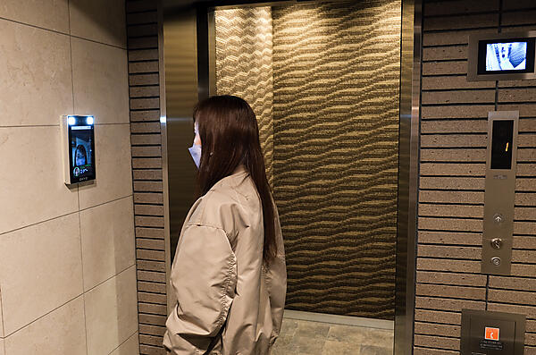 自転車置き場、ゴミ置き場の共有部も、同じくマスクをした状態でOKだ。エレベーターは、顔認証すると行き先階のボタンが自動で押される仕組み。