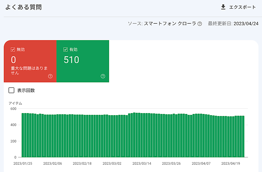 事実、筆者の Search Console にあるプロパティでも、よくある質問のリッチリザルトが4月6日からほぼゼロに落ちていた。