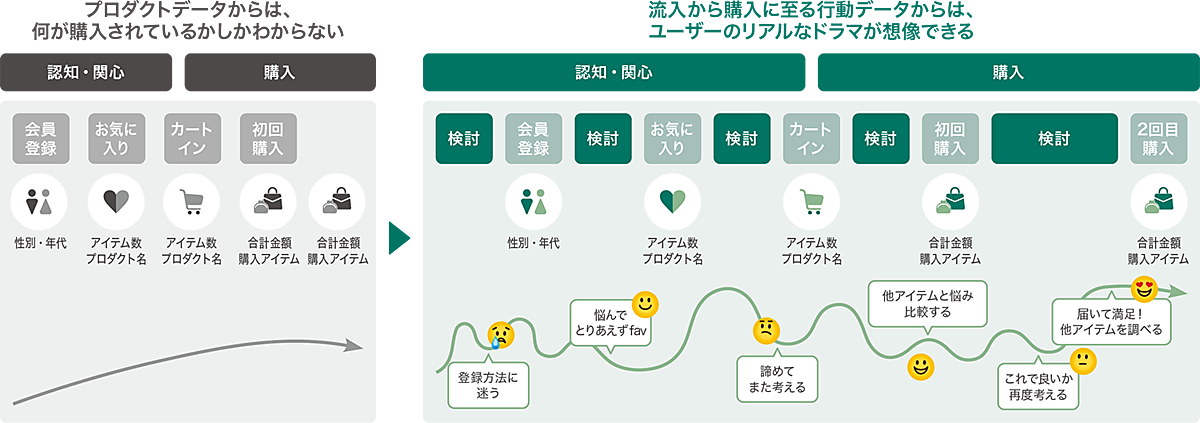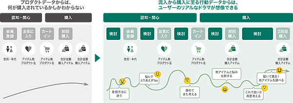 企業の基幹システムに格納されているプロダクトデータからは、誰がいつ、何をどこで購入したかはわかっても、購入に至るまでにどのような行動をとってきたのか、あるいは、どのようなプロセスを経て購入に至ったかはわかりません。