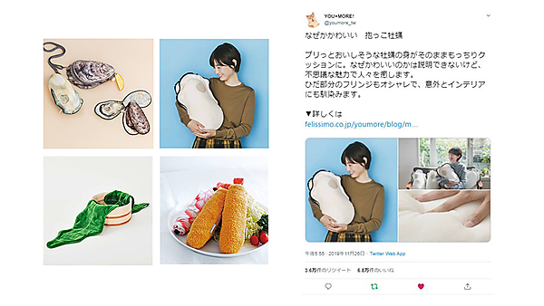 YOU+MORE! が発売した製品の中でも特に話題を集めたのが、2018年発売の「セクシー大根抱き枕」。野菜の収穫シーズンになると、巨大だったり、変わった形だったりの野菜が一般ニュース番組などで取り上げられるが、それをヒントにプランナーが企画したという。また「抱っこ牡蠣」は、牡蠣を赤ちゃんほどのサイズにまで巨大化させたクッションで、これは広島出身プランナーの“牡蠣愛”があふれ出た結果だった。