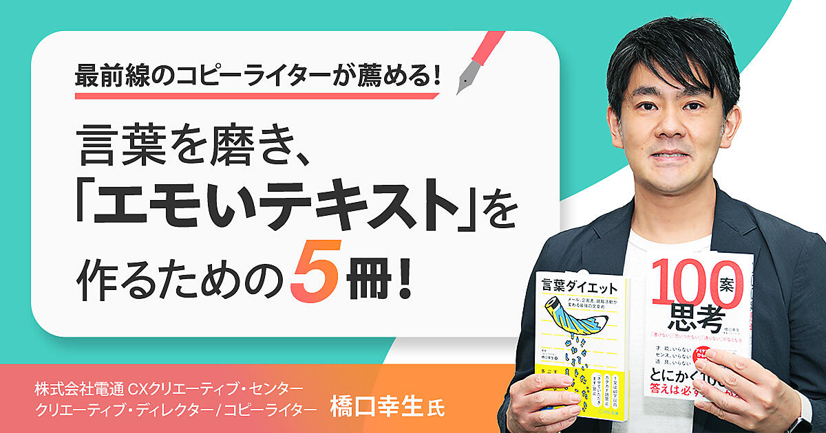 プレスリリースやカタログ、広告のコピー、Webサイトの見出し、SNSの投稿など、Web担当者やマーケターは、言葉でどう伝えるかを考える機会が多い。そこで、今回は言葉で人の心を動かすプロである、電通のコピーライター 橋口 幸生さんに、エモいコピー・文章作成に役立つ書籍を紹介してもらった。