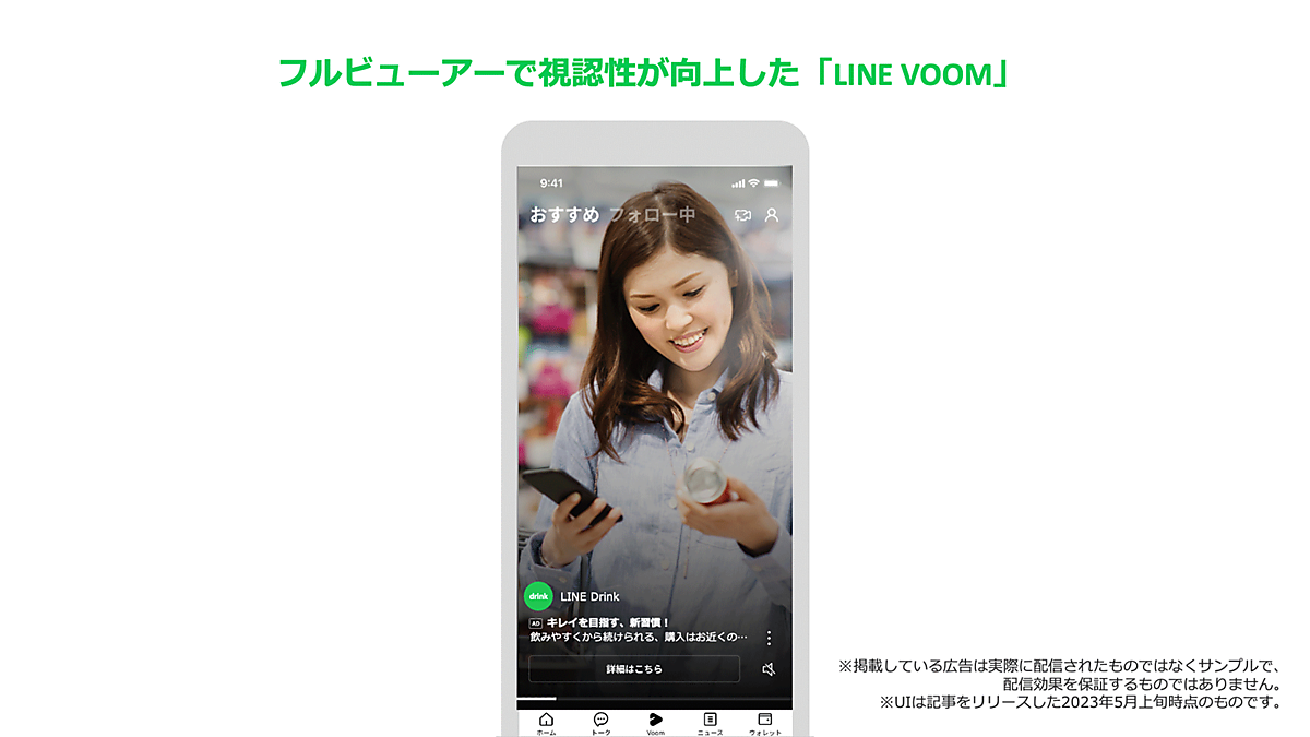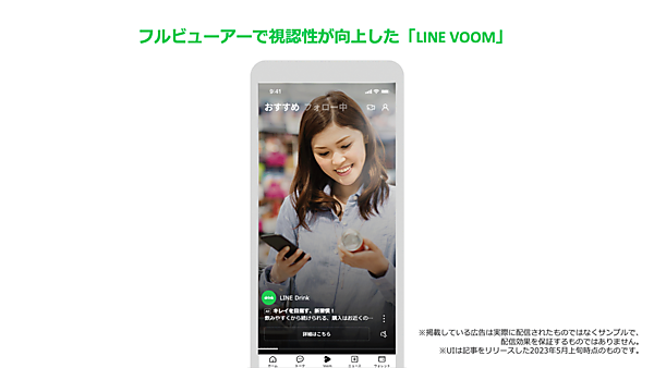 しかも、LINEアプリでは2022年9月にショート動画が楽しめる「LINE VOOM」というサービスのUIをリニューアルし、投稿コンテンツや広告が以前よりも大きく、フルビューアーで表示されるようになりました。