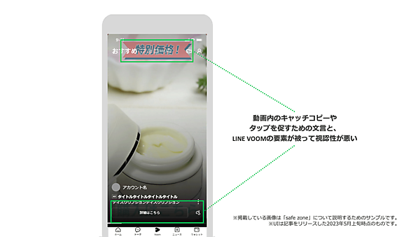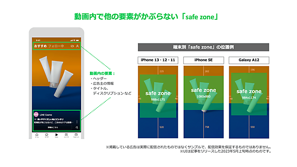 柿崎氏バーティカルサイズの動画は、タップする前は他要素とかぶって表示されることがあります。「safe zone(セーフゾーン)」を意識して配置しましょう。