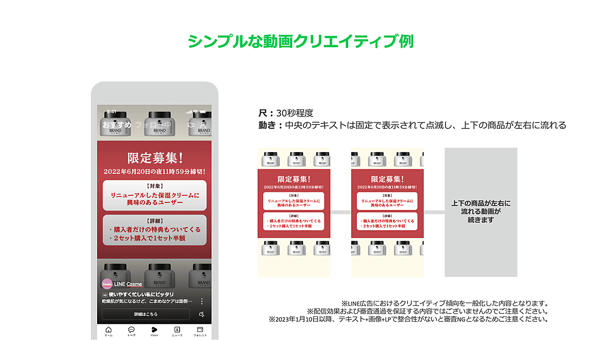 柿崎 これはさすがに見づらいです!(苦笑) 静止画クリエイティブでもお伝えしましたが、可読性の高さはLINE広告を運用する上で大前提です。読みやすい文字色を心掛けるとともに、テキストの量も表示秒数に合わせて読み切れる量にしましょう。