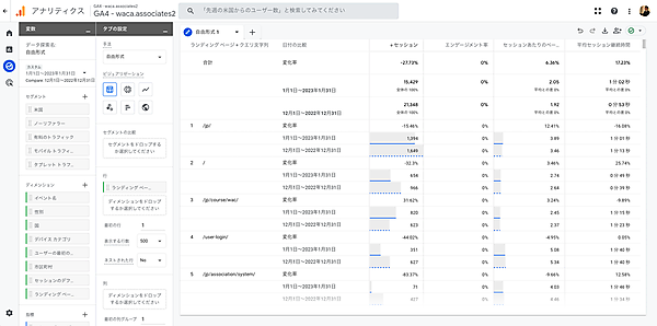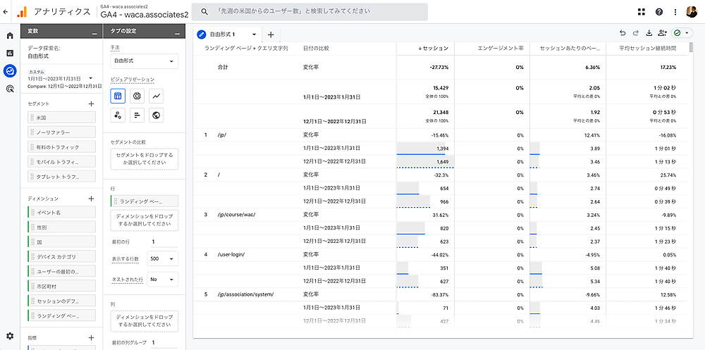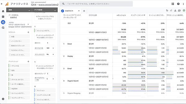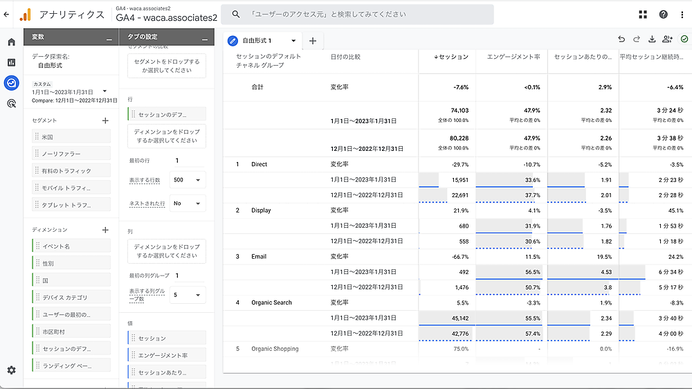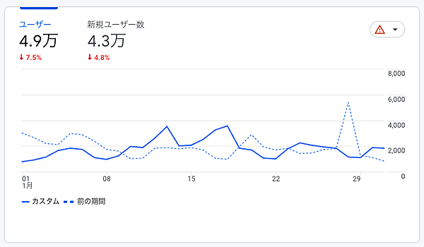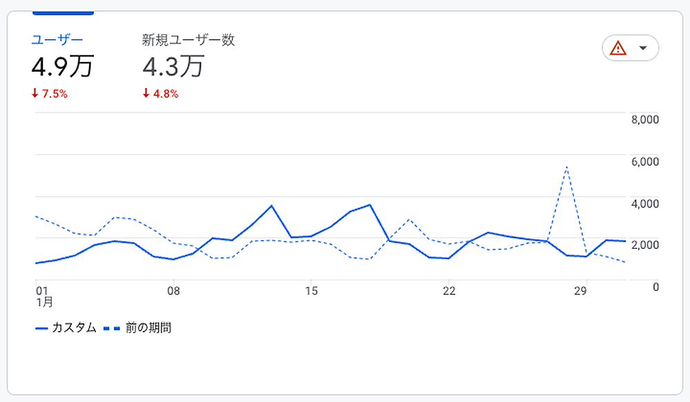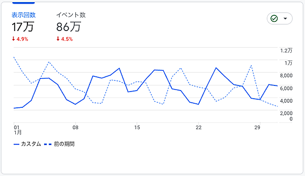 非常にシンプルな数値比較ですが、先月(2023/1/1~2023/1/31、図でいうと「カスタム」)と先々月(2022/12/1~2022/12/31、図では「前の期間」)を比較すると、「ユーザー数、新規ユーザー数、PV数(表示回数)、イベント数など、軒並み4%~8%程度下がっていること」が見てとれます。
