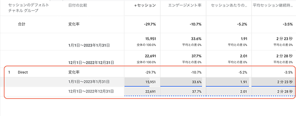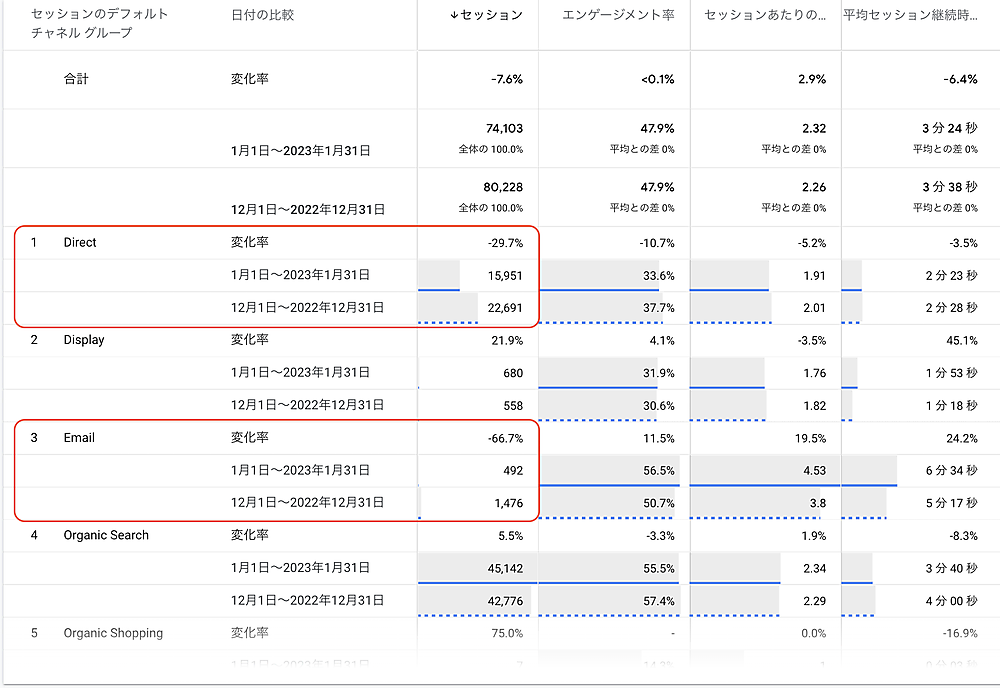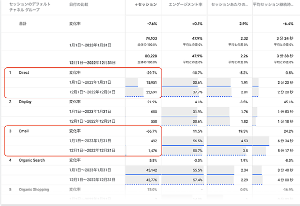 セッション数を見てみて気になるのは、変化率の大きい「Direct(-29.7%)」と「Email(-66.7%)」でしょうか。しかし、あくまで変化“率”なので、もともとの数値が大きくなければ全体にはあまり影響がない可能性があります。