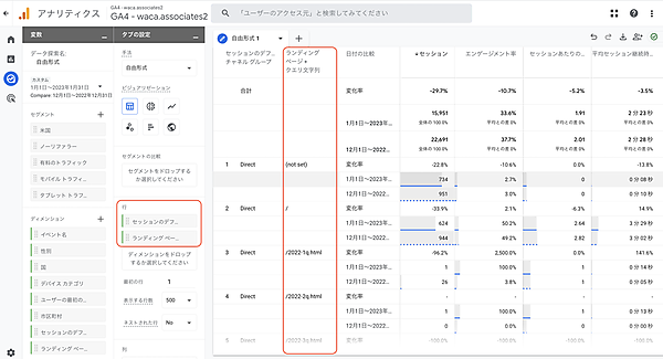 ※実際には、Facebookからのリンクが押された際の「/?fbclid=」など、パラメータがついたURLがランディングページになってしまっているため、「DirectでTOPページに来た」というセッションが「-5,246セッション(Direct減少全体の74%)」と最大の減少要因となっています。