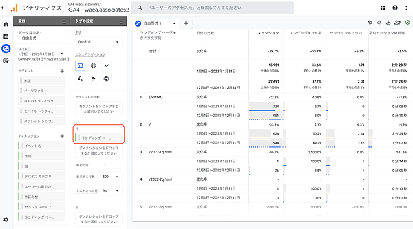 - 探索レポートの「自由形式」を使い、原因を探ってみる。