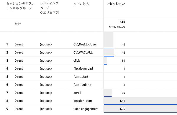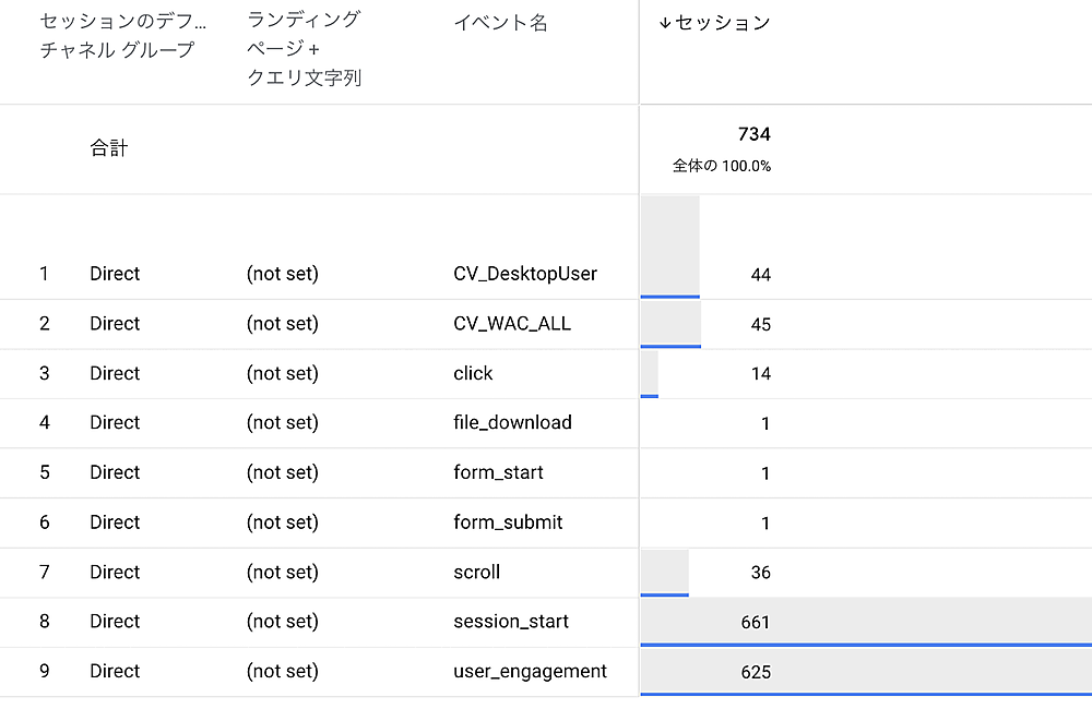 本題に戻りますが、集客方法の問題としては「Direct」に大きく問題がありそうです。ここからは「Direct」に絞って原因を探ってみましょう。