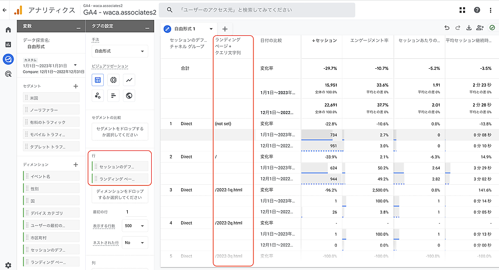 減少ボリュームとして多いのは、「/user-login/(-276セッション、Direct減少全体の4%)」「/jp/association/system/(-356セッション、Direct減少全体の5.3%)」などが続きます(レポート3項目めの「/jp/course/wac/」は197セッション増)。