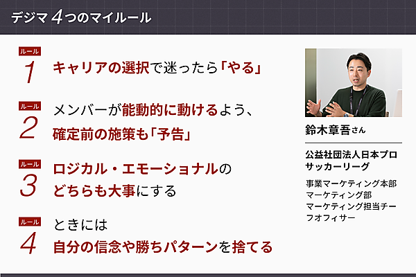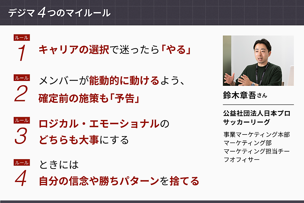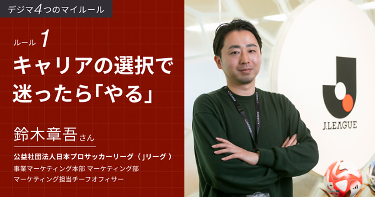 デジマのキャリアを探る新連載。大手企業からスポーツ業界に飛び込んだJリーグ・マーケティング部の鈴木氏に、仕事やキャリアのマイルールを聞いた。