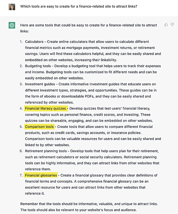 ChatGPT: 金融関連のサイトでリンクを獲得するために、簡単に作成できると思われるツールをいくつか挙げます。