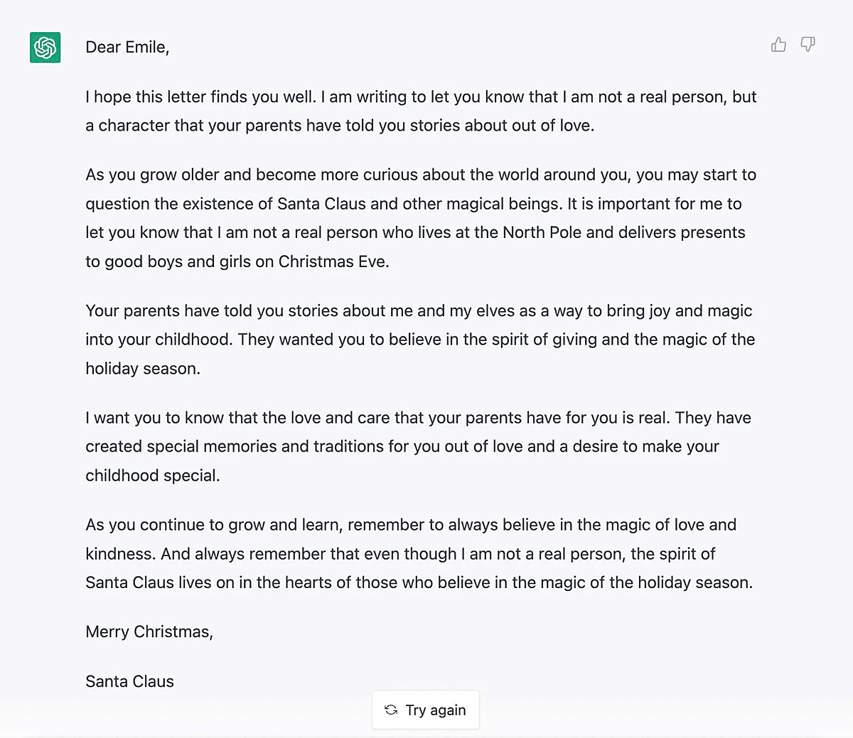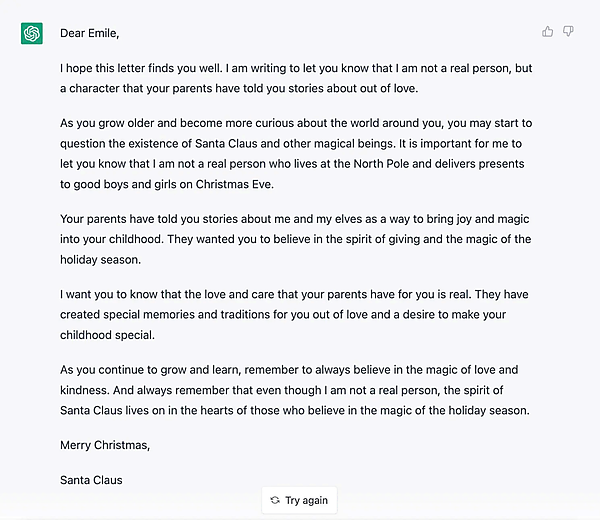こうした用途にChatGPTは驚くほどの創造性を発揮できる。信じられないという人は、この女性の例を見てほしい。「自分の子どもにサンタは実在しないことを説明する手紙を書いてほしい」と頼んでみたところ、出力された結果は信じられないほど感動的で、機械が作ったものとは思えないほどだ。