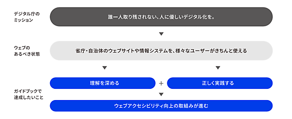 本ガイドブックは、ウェブアクセシビリティに初めて取り組もうとしている行政官の方や事業者向けに、ウェブアクセシビリティの考え方や概要、取り組み方のポイントを解説するための資料です。何にどう取り組めばいいのか、どうやって調達に組み込めばいいのか、委託事業者との円滑なコミュニケーション、意思決定のポイントがわかるようになることを目的としています。