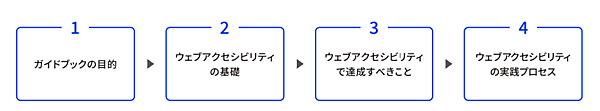 本ガイドブックは、ガイドブックの目的、ウェブアクセシビリティの基礎、ウェブアクセシビリティで達成すべきこと、ウェブアクセシビリティの実践プロセス、の 4章で構成されています。最初から体系的に読んでいただくことをお勧めしますが、どの章から読み始めても自然と必要な知識にたどり着くように配慮していますので、興味がある章から自由に読んでいただくことができます。