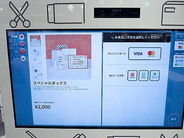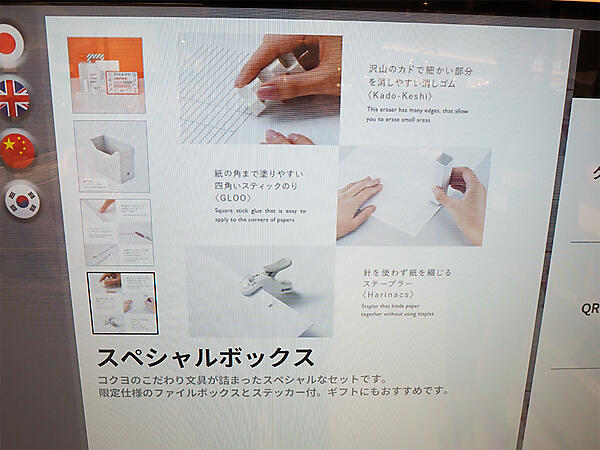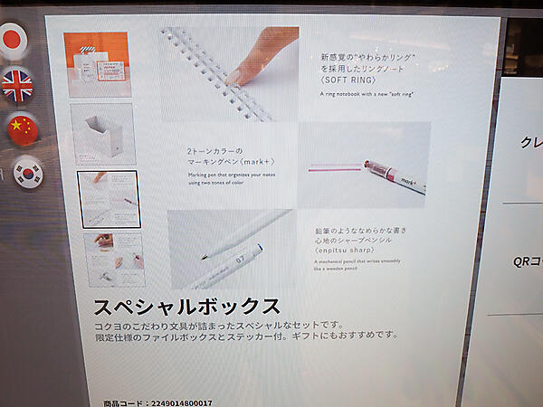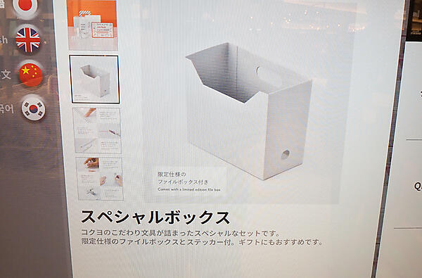 何はともあれ、早速買ってみよう。まずはこの日同行してくださったコクヨのコーポレートコミュニケーション室の大貫氏がオススメだという「スペシャルボックス」から。タッチパネルで商品を選ぶと、商品に関する詳しい説明が画面に映し出される。