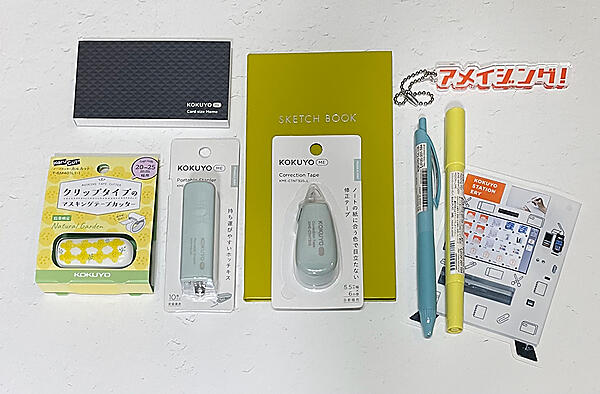 そして筆者が買ったシークレットセットの中身はこれだ。カードタイプのメモ帳、マスキングテープカッター、コンパクトなホチキスと修正テープ、スケッチブック、マーキングペン、ボールペンにアクリルキーホルダーとステッカーだった。