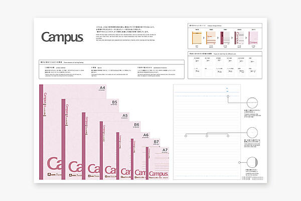 選んだマニアセットはキャンパスノート。早速中を開けてみると、B6からA7サイズまでのノートが4冊にノートを拡張できるふせん、さらにキャンパスノート専用の修正テープが入っており、キャンパスノートのこだわりを図解したポスターが入っている。確かに、マニアックだ…! 筆者は一番小さなA7サイズのノートを売っているお店に出会ったことがないのでレア感と豆本みたいなサイズ感がたまらなかった。