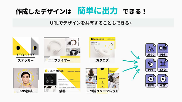 作成したデザインはさまざまなフォーマットで出力できる。Canvaから直接SNSに投稿することも、ちらしやステッカーなどを印刷発注することも可能。URLでも共有できる。