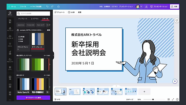 たとえば、テンプレートの色を変更する場合、「スタイル機能」のカラーパレットから気に入った配色を選び、全ページに反映できる。同じように、アニメーションやグラフも一括で設定することが可能なので、ノンデザイナーでも直感的におしゃれなクリエイティブを創出できる。