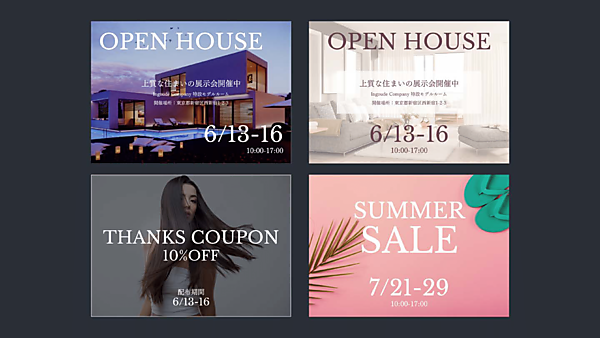を踏襲して、住宅展示会のチラシを他業種のクーポンやセール広告に利用した。こうすることで、オリジナルでプロっぽい仕上がりに近づけることができる。