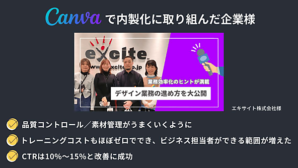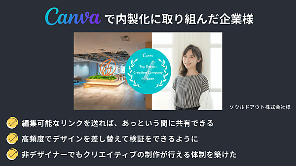 講演では、Canvaによるデザインの内製化に成功した2社の事例が紹介された。