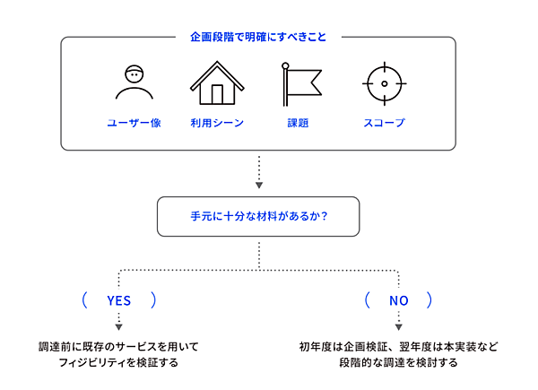 まったく新しいサービスを企画する場合であっても、どのような利用者にアプローチをするのか検討する必要があります。手元に十分な材料がないのであれば、調達は「課題の探索と解決案の検証」に絞ったもの、つまりMVP:Minimum Viable Productの定義に限定するのが理想的です。初年度は「企画検証」、翌年度は「本実装」のように、段階的に調達を実施することを検討してください。