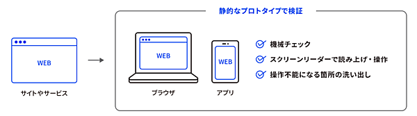 サイトやサービスが精緻化されていく過程(情報システムでは HTMLを組み上げてみるなど)では、実際にブラウザやアプリで確認できる静的なプロトタイプを作ることを推奨します。具体的に操作を試して使用感を確認できますし、スクリーンリーダーを用いて読み上げ・操作をテストすることができます。