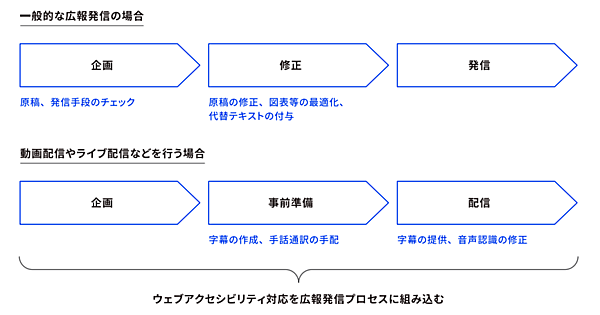 広報などで発信するときの基本的なプロセスとウェブアクセシビリティ対応は次の通りです。