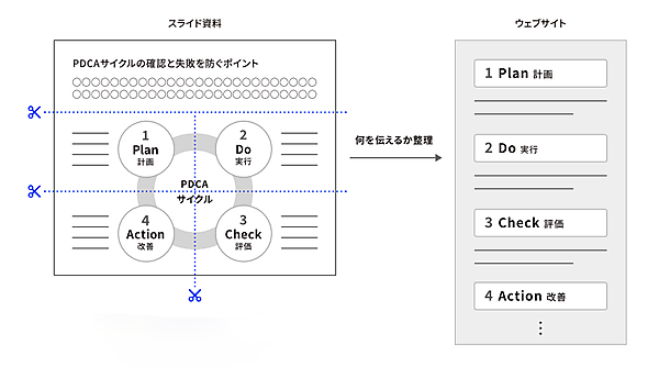 しかし、会議で使う資料はスライドの中に必要な情報を網羅して書かれている場合が多く、そのままウェブサイトに載せるには情報が多すぎて何を読み取ればよいかわからなくなります。そのため、スライド資料で何を伝えるかを整理した上で、資料の図を簡略化したり分割する必要があります。