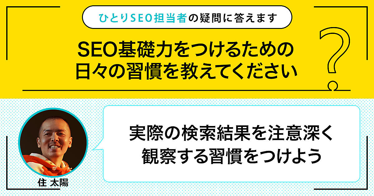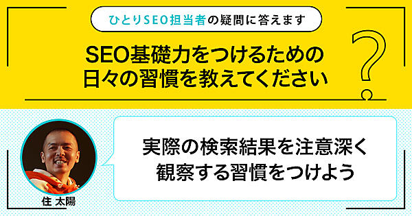 ひとりで頑張るSEO担当者さんの悩みに答える本連載。今回の質問は「SEOの基礎力をつけるための日々の習慣を教えてください」です。この回答は「実際の検索結果を注意深く観察する習慣をつけよう」です。「SEOのヒント」は実際の検索結果に隠れています。それを見つけ出すことを日常の習慣にすることで、SEOの基礎力は高まっていきます。