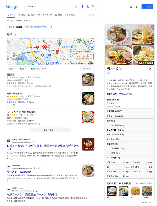 検索結果の画面上部に地図(ローカルパック)が表示されることが特長で、近年では見慣れた検索結果となっています。同種のクエリには「コンビニ」や「カフェ」や「ガソリンスタンド」などがあります。