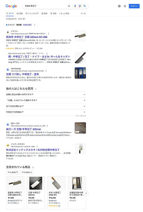 このクエリについてGoogleが理解している検索意図は「全鋼中華包丁をネット通販で買いたい」です。このためこのクエリでの露出を狙えるのは、ショップの商品ページか商品カテゴリページ、またはGoogleショッピングフィードに限られます。