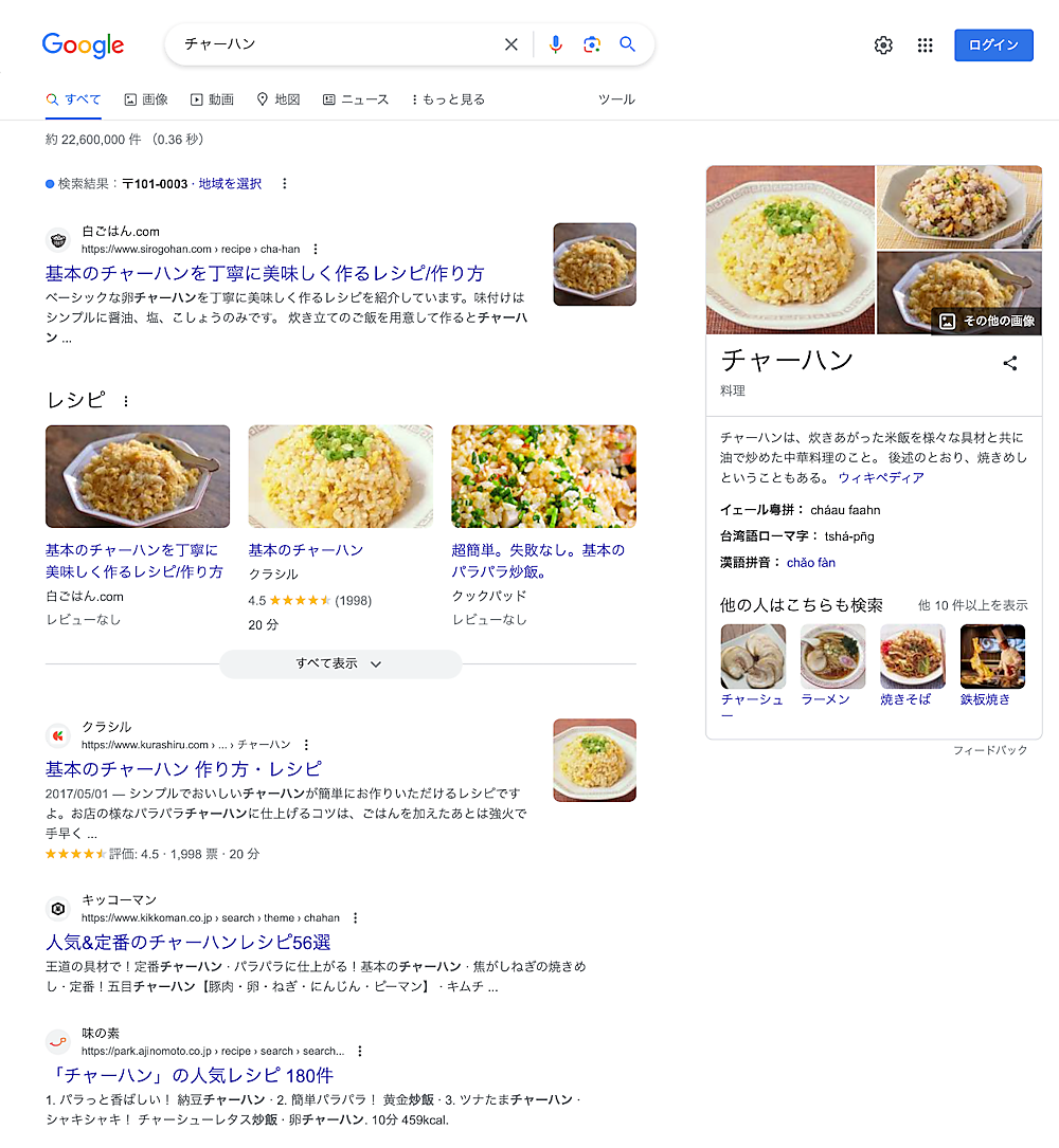 先ほどのラーメンと同じ日本風中華料理ですが、検索結果は大きく異なります。自然検索の上位はすべてレシピで占められており、レシピカードも表示されます。クエリ「チャーハン」では、Googleが理解している検索意図は「チャーハンを作りたい」です。