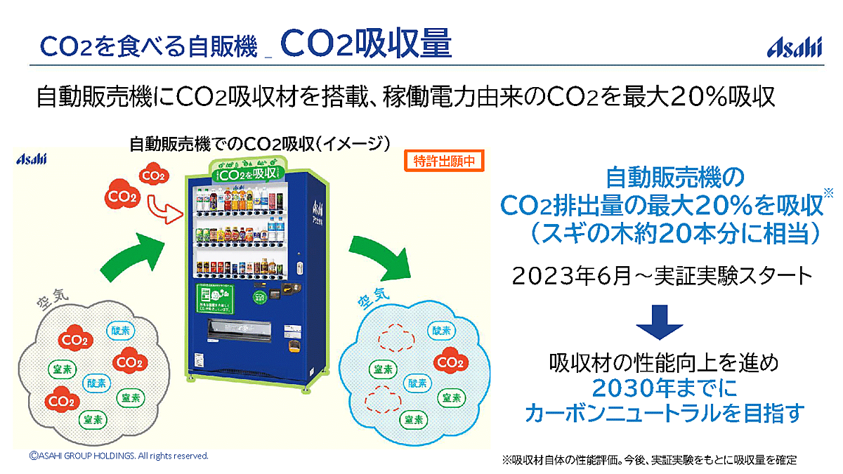 “CO2を食べる自販機”としてテレビやSNSで話題となった、アサヒ飲料の「大気中のCO2を吸収する自動販売機(以下、自販機)」が、2023年6月から実証実験を開始している。