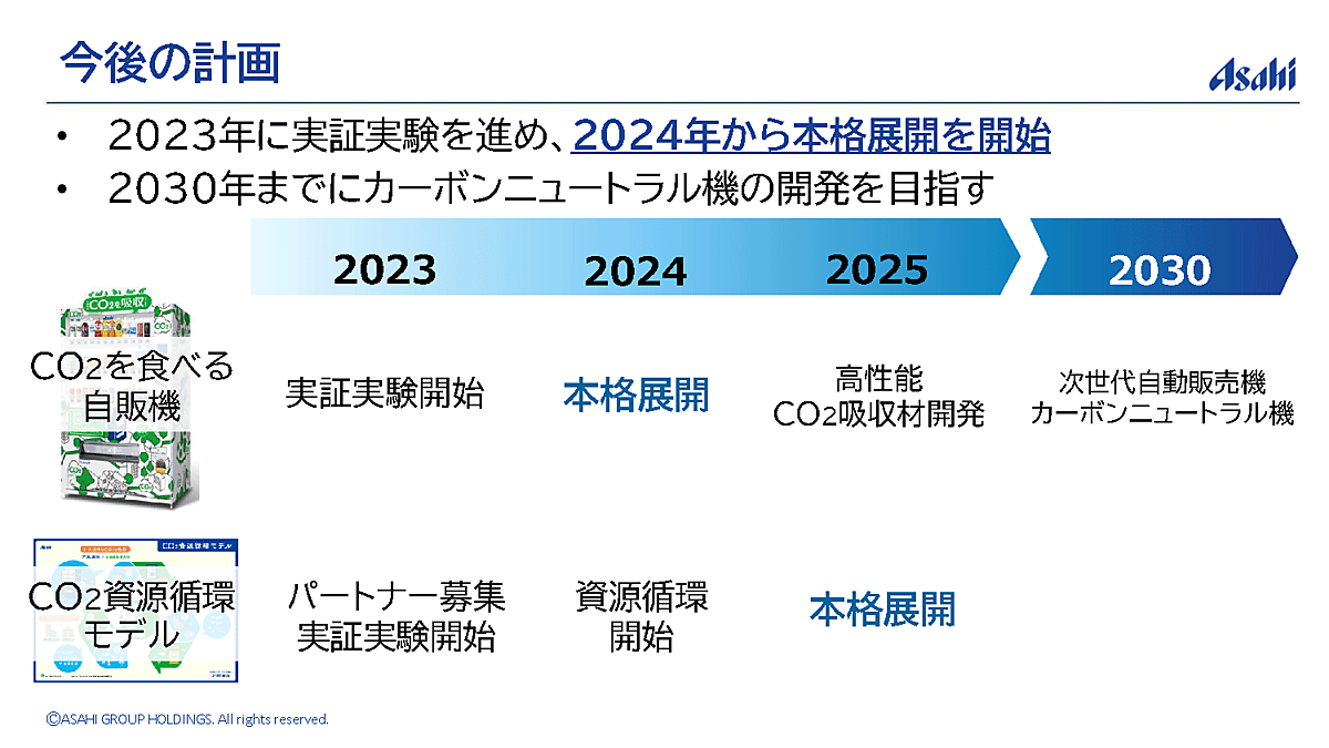 2023年6月から関東・関西エリアを中心に約30台の自販機を稼働させ、CO2吸収量やスピード、オペレーションの検証などを行う。その後、2024年度から本格的な稼働を予定している。