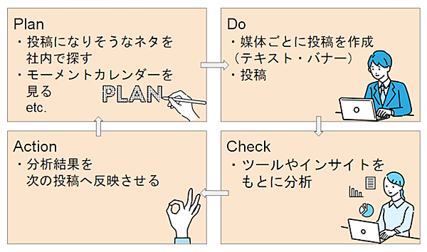SNSのPDCAサイクルは、みなさんご存知の通り、以下の流れで進みます。