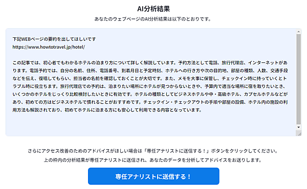 古宿 ページの分析も要約も、AIに読ませるページデータだけでなく、答えを得るために「何をどう問いかけるか」がコツで、そこはインフォネットの知見の賜物と思ってもらえればと思います。まだβ版なので、こちらも要望に合わせて改善していく予定です。