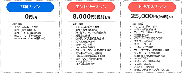 無料プランに加え、より詳細な分析が可能なエントリープラン、AI分析や専門家のサポートが受けられるビジネスプランの3タイプがあり、いずれも導入しやすい価格に設定されている。2023年1月にリリースされて以来、官公庁や自治体、中小企業など多くの企業に導入され、専門知識がない人間でも簡単にGA4を活用したアクセス分析を行えるツールとして好評だ。