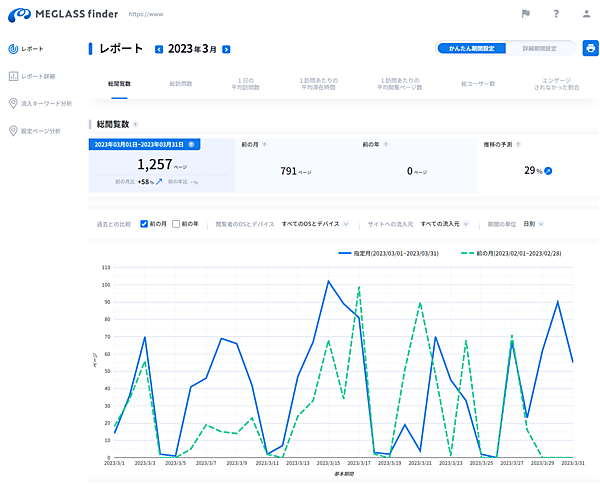 「MEGLASS finder(メグラスファインダー)」は、GA4と連携させるだけで自動的にアクセス分析を行い、レポートとして表示してくれるGA4連携型アクセス分析ツールだ。