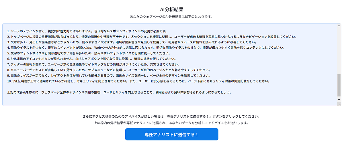 四谷 わわ、すごい。「SEOが十分でない」とか「レスポンシブデザインでない」とか、なかなか耳の痛い指摘がありますね(笑)。でも、AIに指摘される分にはあまり角が立たないから、社内で改善提案する際にも伝えやすそうです。