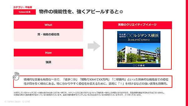 河上 Yahoo!広告の場合は、シンプルに物件などの「質・機能の優位性(What)」を「強くアピール(How)」したもので、高い効果が得られました。