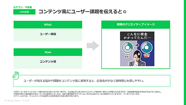 相樂 LINE広告の不動産業種の広告を分析すると、「ユーザーの課題(What)」を、「コンテンツ風に(How)」訴求する方法が効果的だとわかりました。