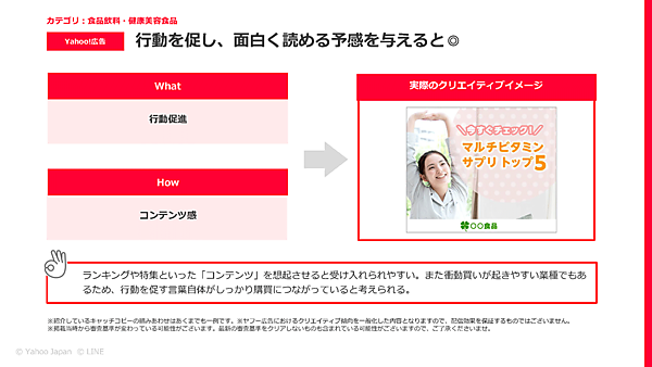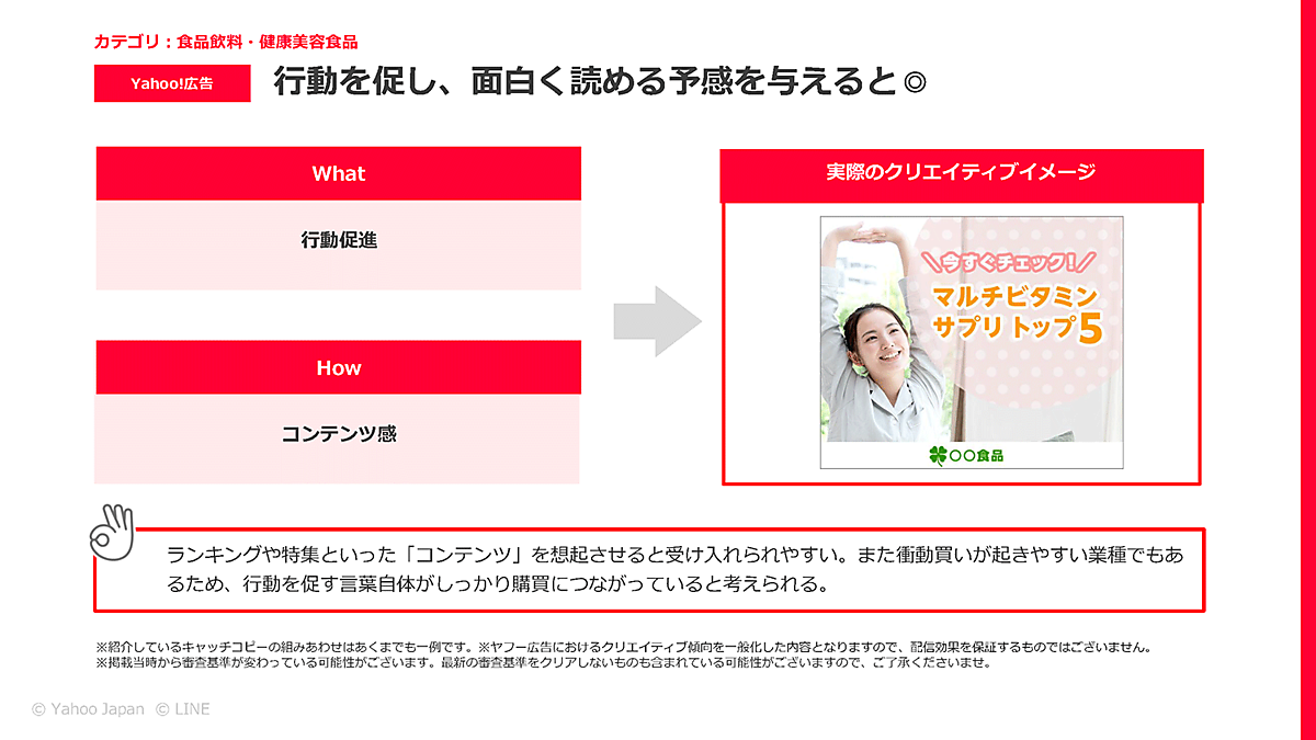 さらに、「行動促進(What)」を「コンテンツ感(How)」があるように見せるのも有効です。たとえば、「効果の高いサプリ トップ5はこれ!」といったものですね。コンテンツ風に見せる手法はLINE広告の不動産業種でも注目されていましたが、Yahoo!広告の場合は、ユーザーが情報を求めている割合が高いことから、遷移先のランディングページ(LP)の情報をより充実させるのが必須です。