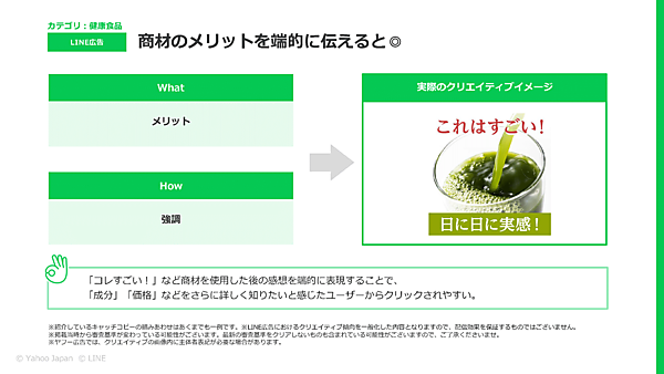 相樂 健康食品では、「メリット(What)」を「強調(How)」した“端的な”キャッチコピーが有効です。スマホ環境を前提として、小さな配信面に広告が表示されることが多いLINE広告でも「えっ? 何?」と思わせることでユーザーの目に留まり、広告としての威力を発揮します。