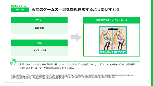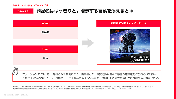 河上 いまお話しした例ですとそうですが、もちろん、LINEで有効なコンテンツ風のクリエイティブは、Yahoo!広告でも業種やターゲティングによって効果を期待できるものもたくさんあると思います。