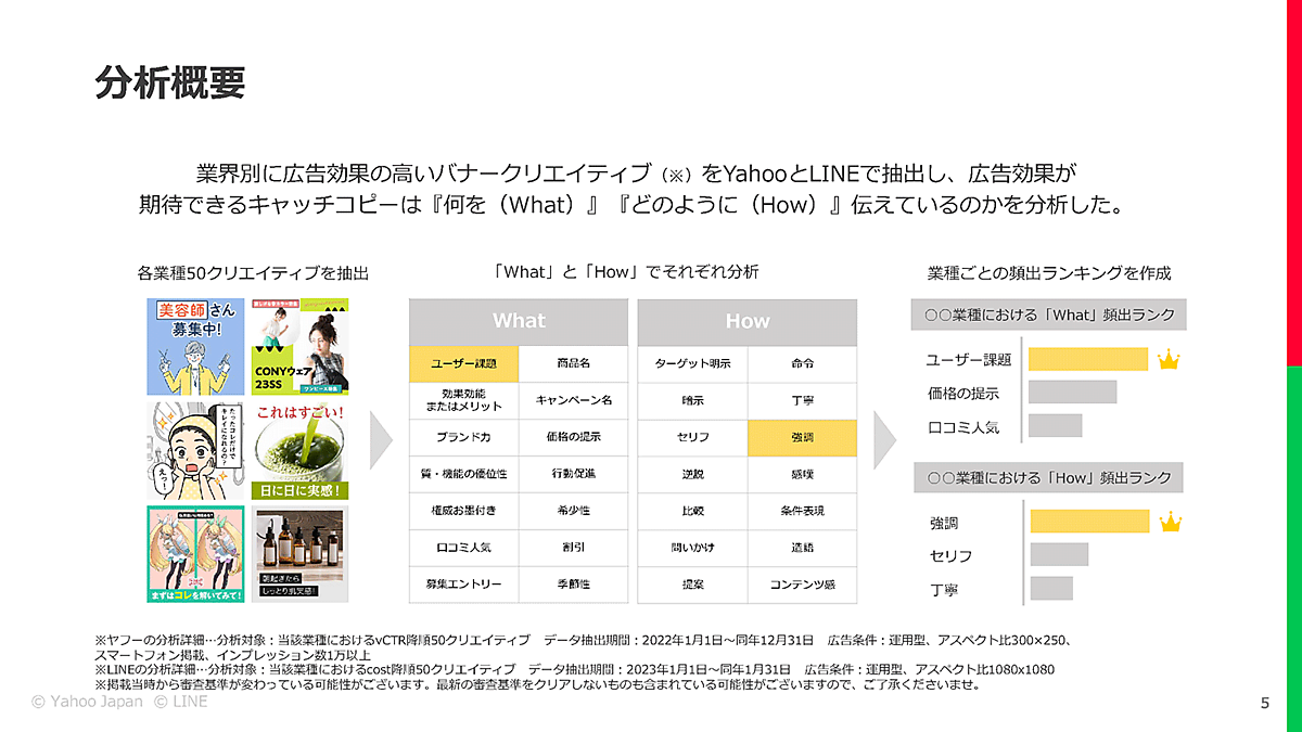 業種ごとに、効果の高いクリエイティブのコピーから「何を(What)」「どのように(How)」伝えているのかを抽出して分析し、LINE広告、Yahoo!広告、それぞれで効果的な文言や言い回しを考察しています。