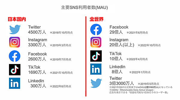 Facebookの国内利用者数は、TwitterやInstagramを下回っています。しかも、Facebook自体をやっていない、Messengerをやるためだけにアカウントを持っているという人も多いです。一方、右側は全世界での利用者数ですが、Facebookは29億人もユーザーがおり、やらない理由はないともいえます。私は経験上、Facebookでつながることを強くおすすめしています。