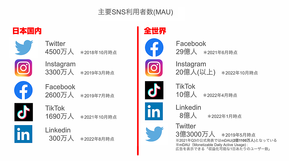 主なSNSの利用者数を見ると、おおよそ以下のような数値になっています。集計年月日にかなりの幅がありますが、各メディアが発表した数字を基本としており、各メディアの最新発表がこの日付だからです。